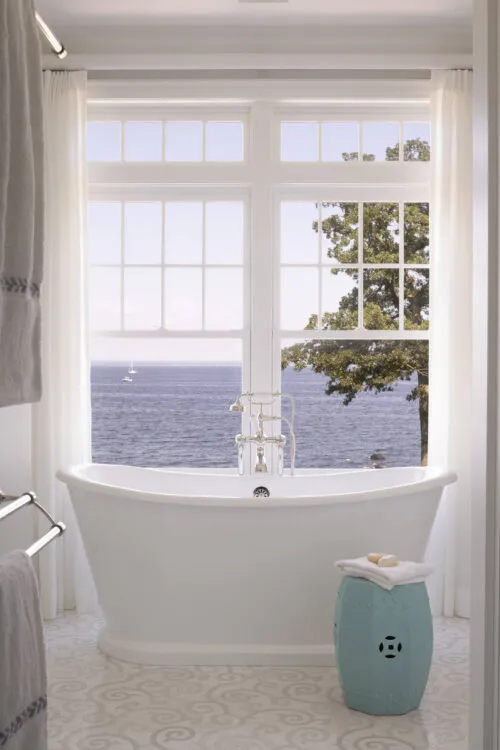 This master bathroom features infinite ocean views. The pedestal tub centralizes the window and maximumly take advantage of the beautiful ocean view. The pastel blue stool complements the blue shade of the ocean while the gray patterns of the white floor bring texture to space.