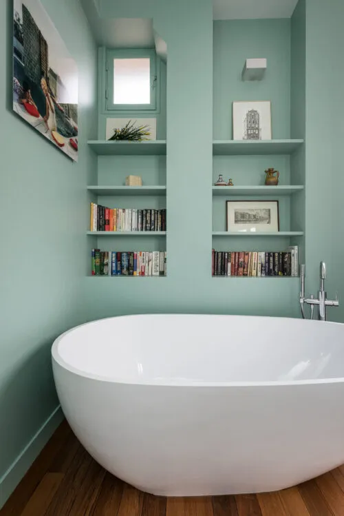 Bathrooms are perfect places to find some me-time and including a small library will allow you to spend this time with quality. In this contemporary bathroom, small, recessed niches are turned into a home library with shelves. The library provides a beautiful backdrop behind the white freestanding bathtub and also maximizes functionality. The pastel blue walls create a relaxing atmosphere.