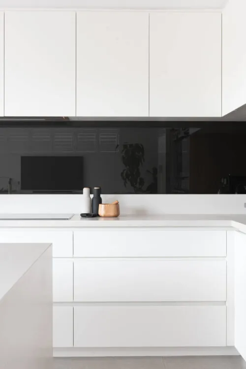 White Glass Sheet Backsplash with White Cabinets and Gray Countertops