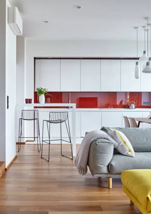 Colors are as important as the forms of the furniture itself as they apply a specific mood to the spaces which in turn impact their users as well. In this kitchen, for example, what welcomes us is an ambitious design with a red-colored glass sheet backsplash that evokes a sense of passion. To keep this backsplash as the statement piece, the rest is kept achromatic and is occupied by the white flat-front cabinets and white countertops. Also, getting a white peninsula with black stools instead takes the intimacy of the design to the next level, emphasizing the pleasure of cooking and eating with friends or family members.