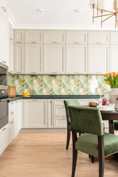 Off-white Cabinets with Green Leaf-patterned Backsplash and Gray Countertops