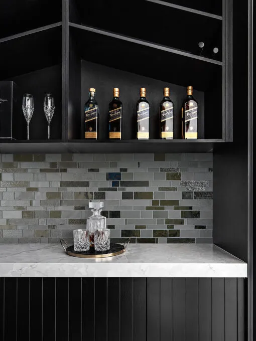 To give your kitchen an additional function, you can build a home bar at the corner. As you can see here, this home bar consists of a gray, white, and black color scheme, offering a timeless and sophisticated look. The black cabinets with their beaded design provide a nice textural look without overpowering it. The gray hand-cut mosaic tile backsplash brings a unique and authentic appeal with its irregularities in shape, size, and color. Above, the diagonal design of the open cabinets enhances visual interest, providing a place to display the bottle collection.