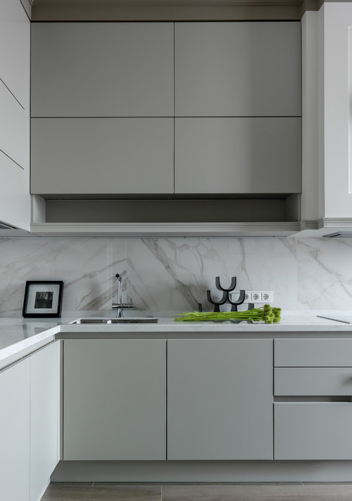 Gray flat-panel cabinets with a white backsplash are a perfect pack for contemporary and modern kitchens. Linear lighting fixtures, cantilevered islands, rounded and upscale range hoods, and wood-carved stools with biomorphic forms can be integrated into these kitchens. As for the backsplash, marble slabs, quartz, and seamless glass sheet backsplashes are great options to consider.