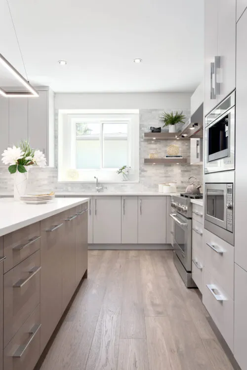 Here we have a natural modern design that aligns itself with beach-style looks, thanks to the satin finish square tile backsplash and ribbed front panel of the island. The backsplash adds a shimmering effect that lets lights bounce off around the room, while the upper light gray cabinets provide a calming contrast with the wood screening of the island. The stainless-steel appliances, white floating shelves, and a white linear lighting fixture enhance the stylish look of the kitchen without overcomplicating it or creating visual clutter so that the kitchen can retain its modern vibe.