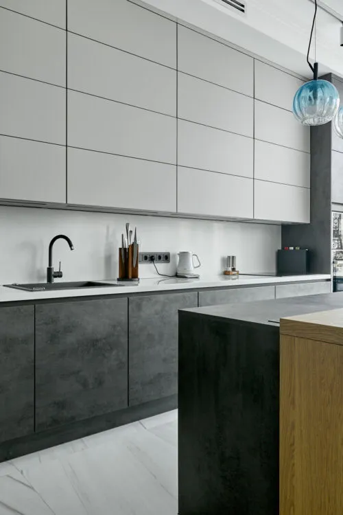 Juxtaposing different shades of gray cabinets makes the kitchen feel more authentic and less matchy-matchy. Also, consider using different textures even if they are faux or imitated. This contemporary kitchen, for example, goes with concrete-effect cabinets. And a two-tiered island adds a layered look as a bonus.