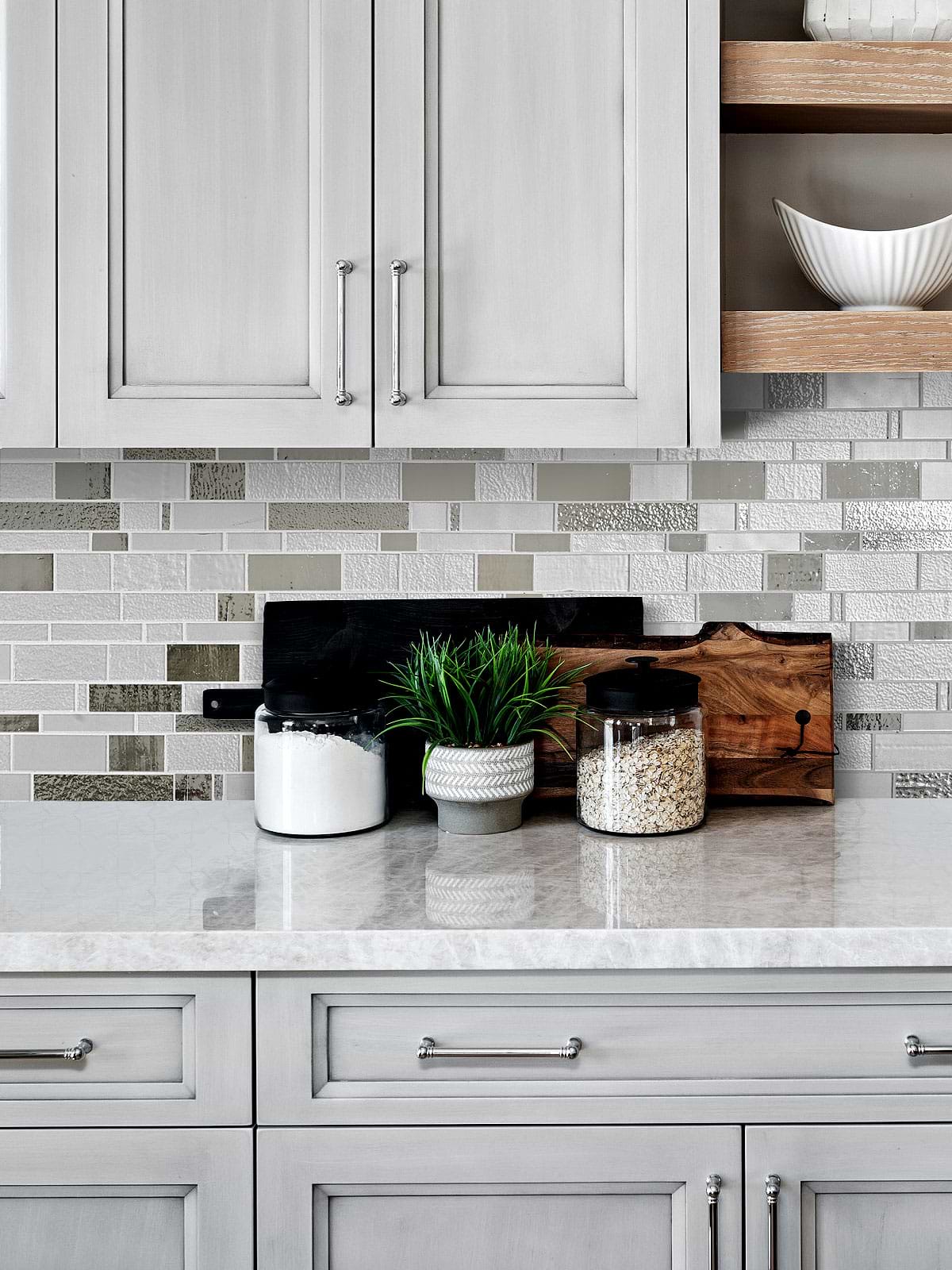 Featuring gorgeous striations, artisan mosaic tiles embody the ultimate form of elegance and sophistication. Here, the bluish-white backsplash with pronounced and understated striations imparts a sense of calmness to the kitchen. The white raised-panel cabinets draw a classic profile for the kitchen. The addition of the artisan mosaic tiles and pure white quartz countertops makes a modern twist against this traditional look. The barely there brass cabinet knobs slightly punctuate the cabinets and complement the luxurious sense of the glass tiles.