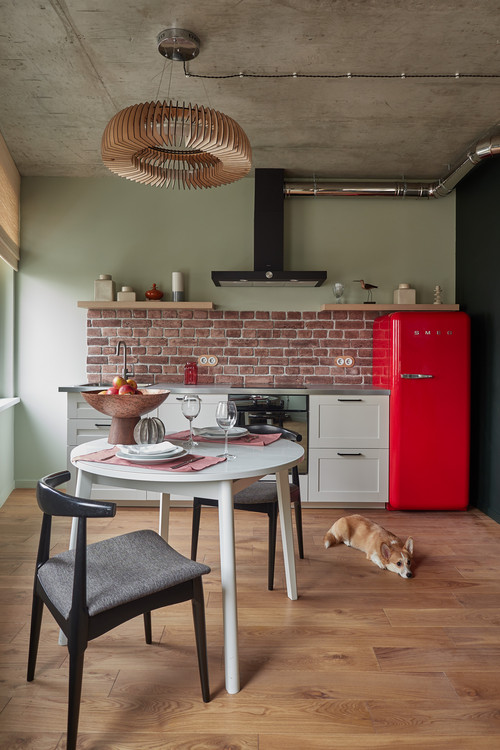 This tiny industrial kitchen looks very unique and stylish with its blue glossy subway tile backsplash and brick wall. Combining these two patterns creates wholeness and continuity in the space. White flat-panel kitchen cabinets help to give attention to these backsplashes. Also, the wooden stools with green leggings and the green curtain add more color and movement to the space and they highlight the backsplashes.