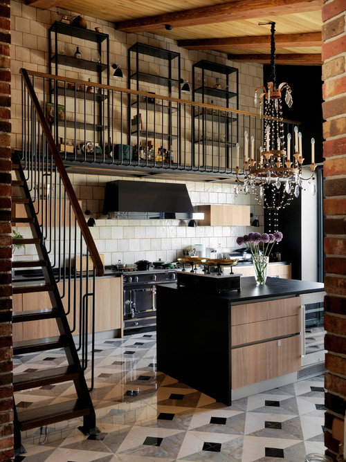 Matte Black And Wood Flat Panel Kitchen Cabinets In A Tiny Industrial Kitchen