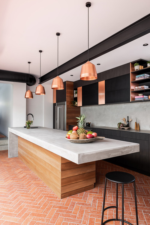 This dark color schemed industrial kitchen is trendy and authentic. The black walls, black glass front, and flat-panel kitchen cabinets do not make the kitchen environment dark or suffocating because of the beautiful light hardwood cabinets and countertops. The light hardwood cabinets and countertops on both kitchen island cabinets provide light and warmth to the space. Also, the brick wall backsplash adds color to the cooking space. Lastly, the industrial-style kitchen lighting fixture with copper detail invites coziness and stylishness to the kitchen.