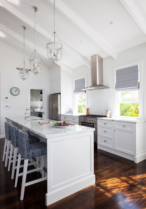 Floor Length Sheeers for a Transitional Kitchen Design with White Shaker Cabinets