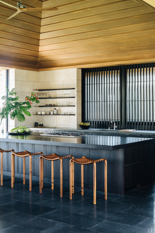 This kitchen showcases a harmonious blend of classic and contemporary design, with its dark wood flat-panel cabinets and black stone countertops providing a traditional look, while the black appliances and white floor tiles bring a modern touch. The wood-detailed white ceiling adds depth and interest to the space, while the light beige floor-length sheers bring in natural light, keeping the kitchen bright and inviting.