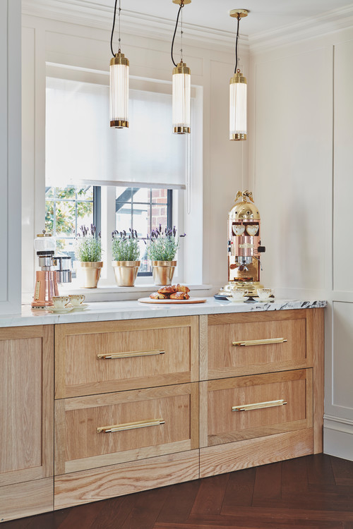 Transitional Kitchen with Warm Textures and Brass Accents