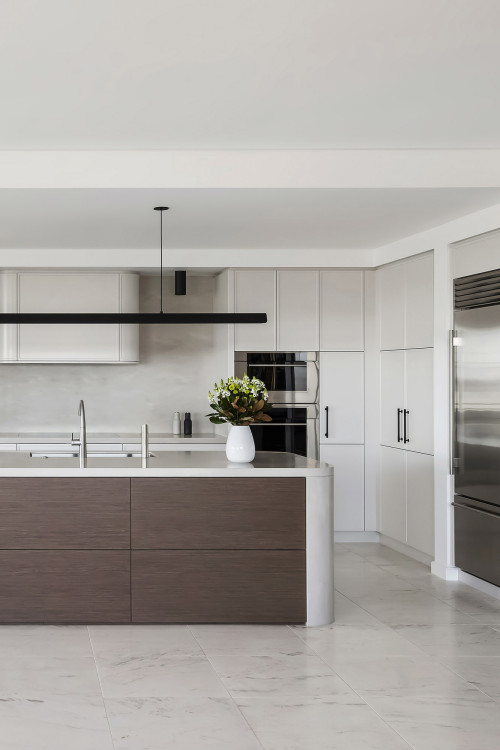 The white flat-panel cabinets and the white kitchen floor tiles are divided by the black countertops and the waterfall of the peninsula. White porcelain tile floors and the black quartz countertops create a natural appeal with stylish contrast. The white veins of the black countertops blend with the white floor tiles.