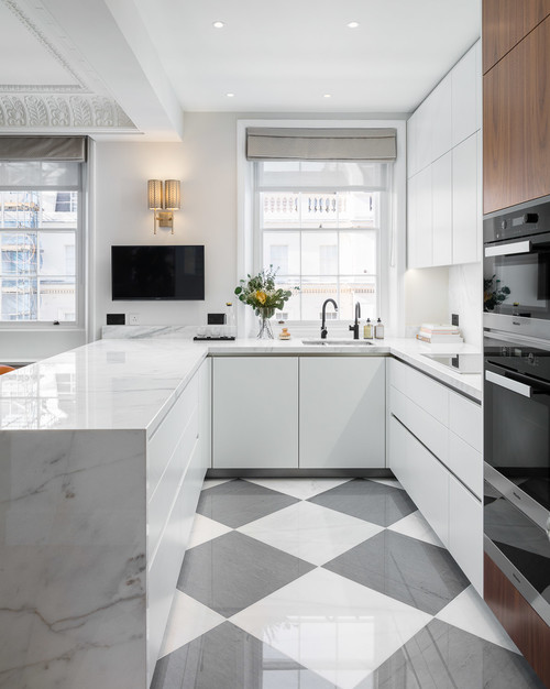 White Marble Kitchen Floor Tiles with Hexagon Patterns and Gray Flat-Panel Cabinets