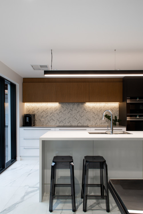 Modern Kitchen with Gray Patterned Backsplash Tiles