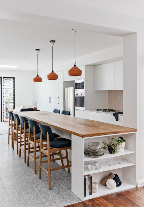 Mid-Century Kitchen with Black Pendants for White Kitchen Island