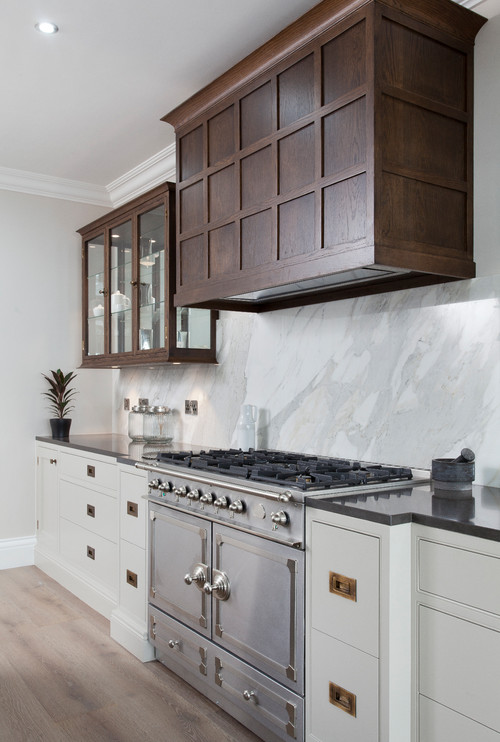 The dark wood upper cabinets and gray flat-panel base cabinets bring out the remarkable harmony between beige and gray. The dark wood upper cabinets paired with brown granite countertops cast a spotlight on the marvelous slab marble backsplash pattern. The brown hues are illuminated wonderfully by the meld of the gray flat-panel base cabinets and gray floor tiles, evoking a sense of warmth and coziness!