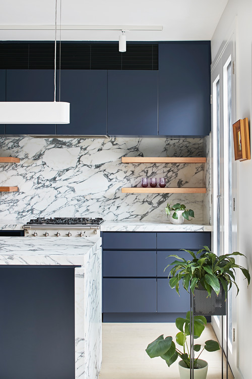 To bring an earthy note to the design, this transitional kitchen goes with a marble backsplash that features brown veining (not blue- even though the cabinets are blue) Used both as a backsplash and countertops, the marble perfectly coordinates with the rustic wood floor finish. The herringbone patterns add vibrancy and movement to the kitchen.