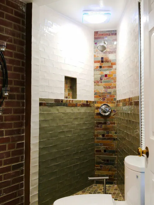White Penny Tiled Shower Niche with Blue Glass Hexagon Shower Walls