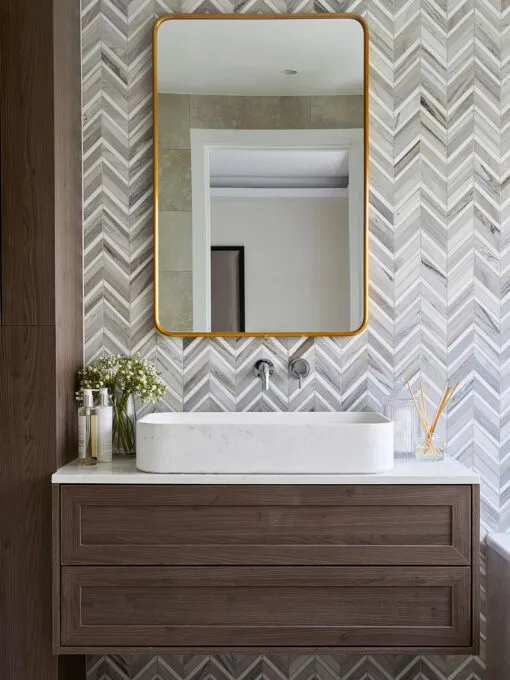 White Bathroom Vanity with Marble Chevron Backsplash