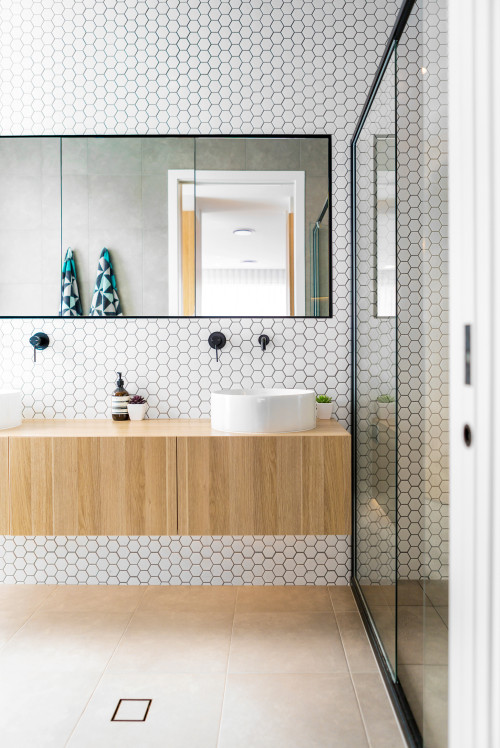 Small Bathroom Design with Wood Vanity and White Hexagon Tiles
