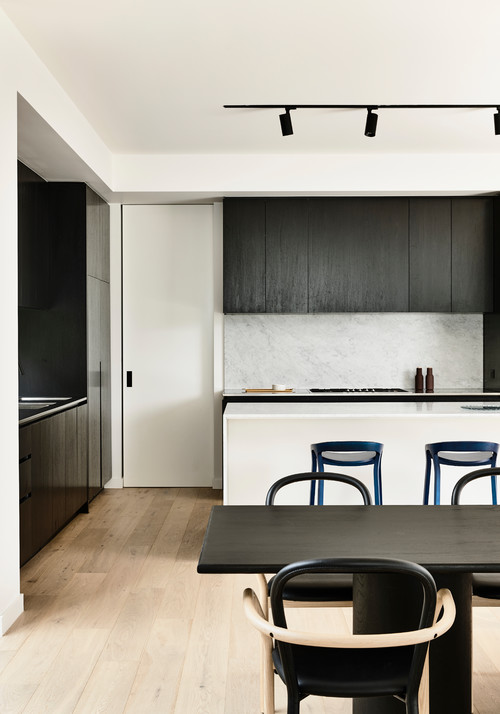 Contemporary Design Style with a Monochrome Kitchen Backsplash and Black Cabinets