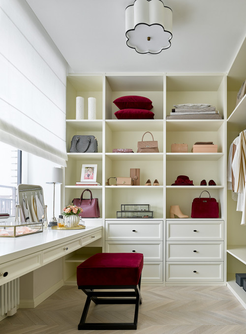 This beautifully-designed room is an excellent showcase of practicality and style in a limited space! Its white structure with lightwood accents provides ample storage for both clothes and accessories. Moreover, the clever addition of a small makeup vanity with a stylish chair in front of the window creates a cozy and practical workspace. The white walls and floors not only enhance the room’s brightness but also make it appear more spacious. On top of everything else, a colorful glass chandelier adds a playful and unique touch to the overall atmosphere. For those who desire an effective and fashionable wardrobe room, this open closet is the ideal fit.