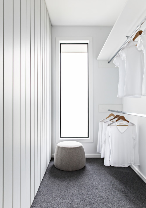 This contemporary closet design boasts a stylish light wood construction with white flooring and a contrasting large dark gray carpet. The generously sized window magnificently illuminates the space, highlighting the elegance of the light wood shelves, pulls, and glass shelves. The clean white ceiling embodies a bright and simple yet sophisticated look while the open and glass shelves provide more than enough storage space for clothes and other accessories. If your taste leans towards modernism and practicality, this open closet is the perfect fit for you!