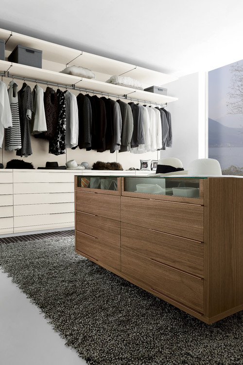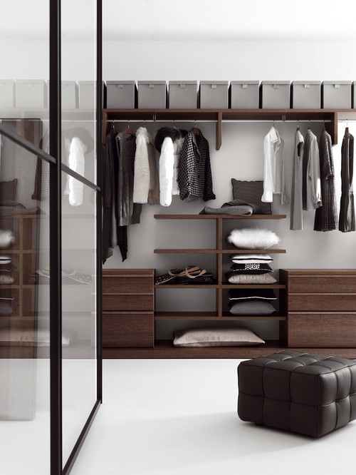 Do you want to keep your pants, dresses, and shirts separately? Then a closet divided into multiple sections with large and small departments can help you with that. In this contemporary closet, from shelves to the parts with rods, there are multiple sections. Each is specifically dedicated to trousers, jackets, shirts, and shoes. The resulting product? It is well-organized and one can easily find whatever it is they are looking for.