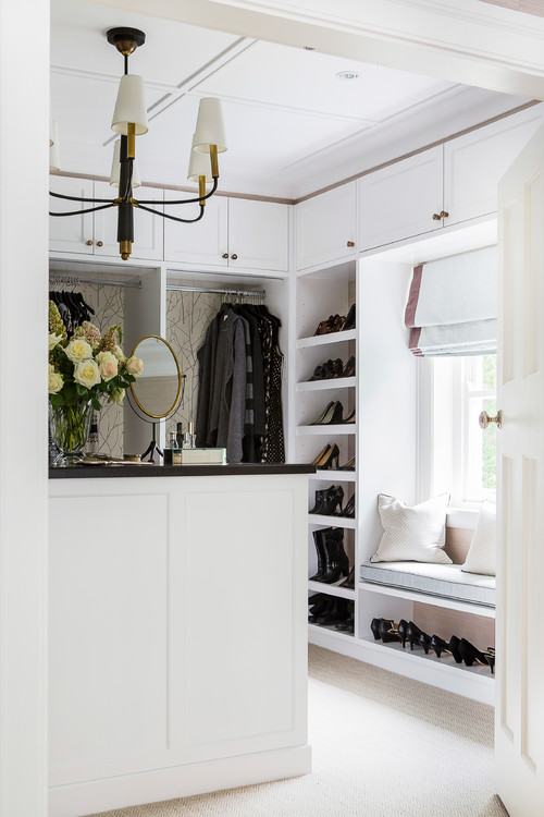 Keep it all-white to spot anything you are looking for easily. In this transitional closet, all-white cabinets create a clean-lined look, spiced up with brass accents. Open cabinets expose shoes and bags separately. Clothing rods installed in two rows keep the t-shirts and blouses separate. As such, users find it easier to dress for formal and informal occasions. And in case you would like to add some luxury, don’t skip on incorporating a chandelier and marble countertop for a central commode.