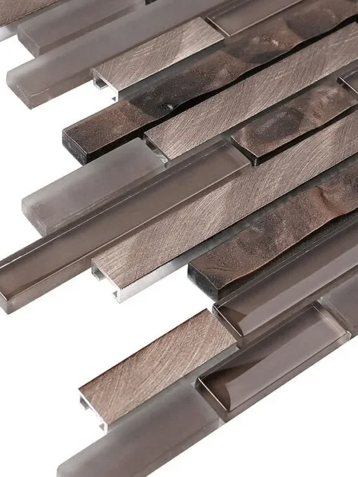 Bring a dramatic elegance to your home with this Brown Glass & Metal Backsplash Tile! Ideal for the most modern home décor applications, the sleek finish and clean lines in this metal and glass mosaic tile will catch your eye with their flashy movement! The narrow slats of varying gloss levels and textures create an aesthetic appeal that is difficult to deny.