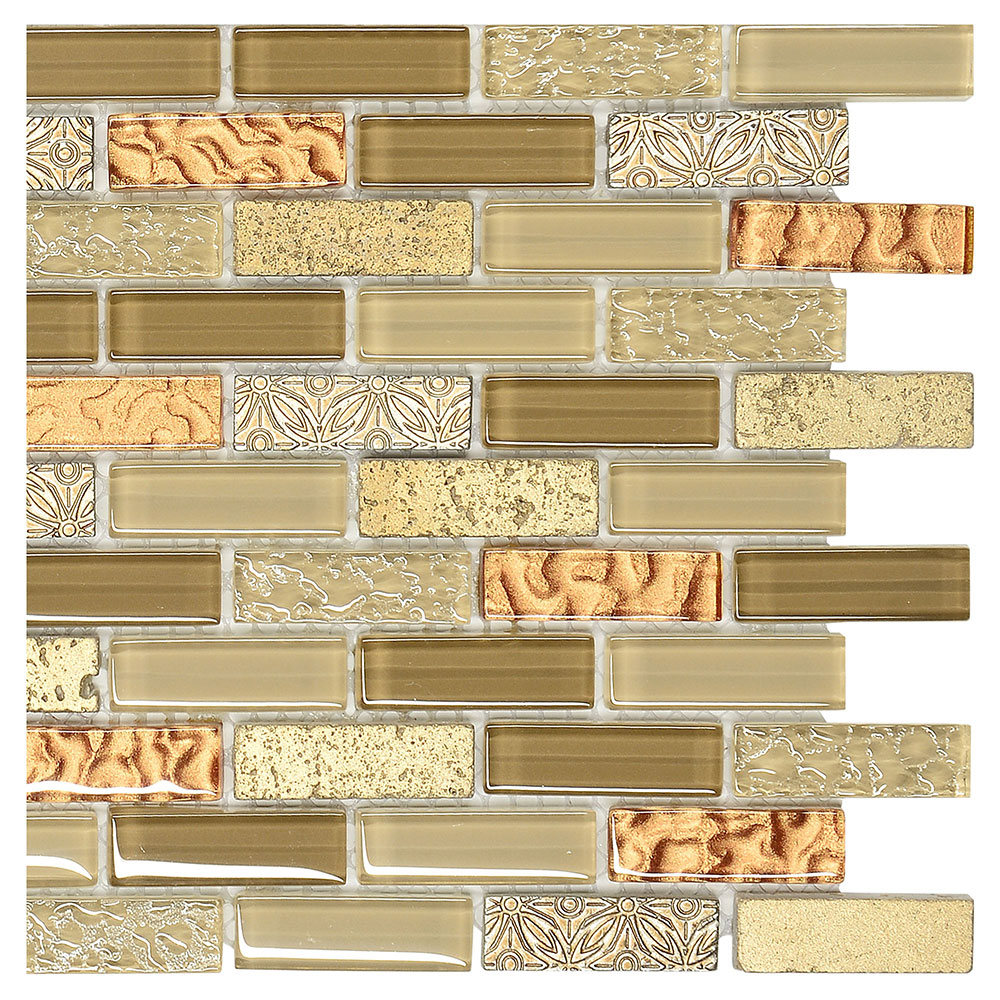 With a glamorous and luxurious feel, the brown, beige, and copper metallic glass mosaic tile enhances any interior.