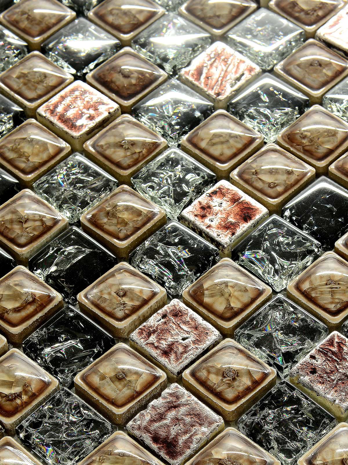 Black and brown mixed backsplash mosaic tile made of a unique combination of glass, stone, and ceramic. Adding elegance and style to kitchens and bathrooms