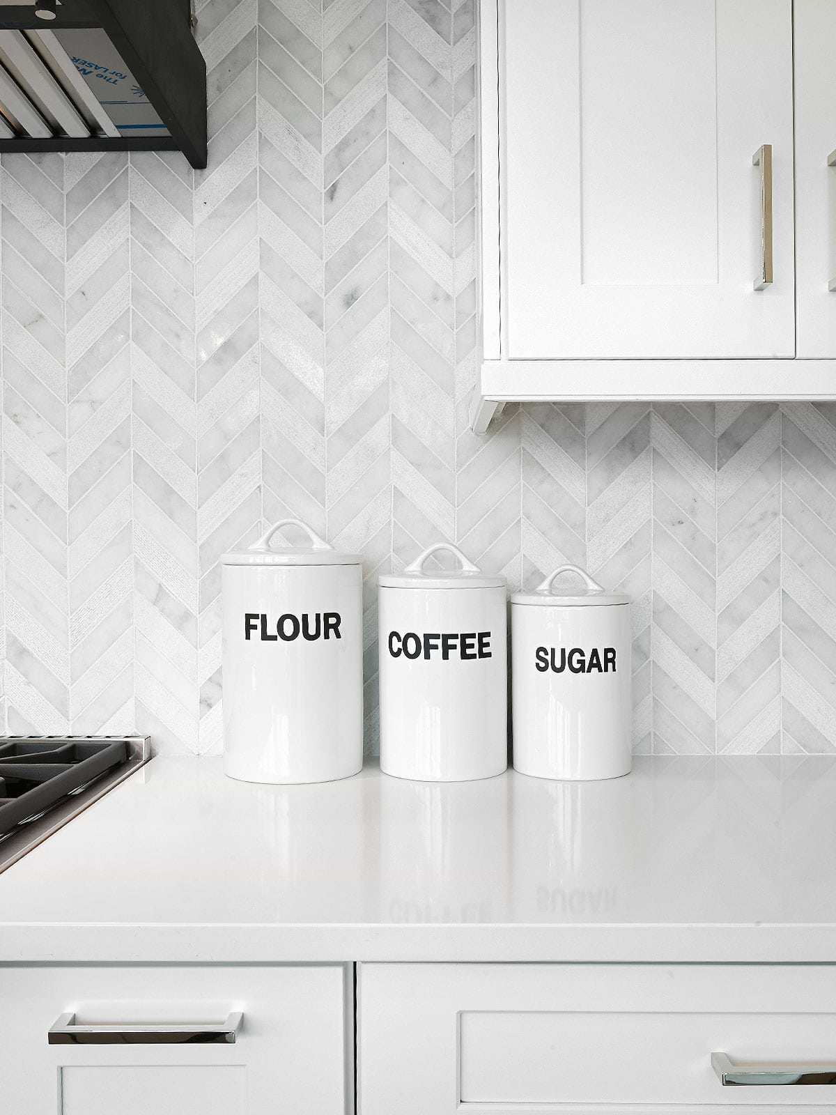 The sleek appeal of the white chevron tile backsplash looks stunning with the marble countertop and white cabinets.