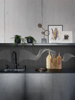 Modern black stone tiles with custom engraving bring a unique, elegant touch to any backsplash.