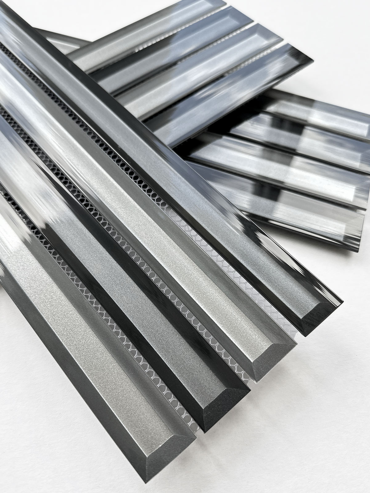 Elevate your space with our Modern Gray and Black Glass Mosaic Tile. With its beveled edge, this sophisticated tile adds depth and character to your interior decor. A generous 18 inches in length, it exudes a luxurious and spacious ambiance, making it an excellent choice for a kitchen backsplash, bar area, or bathroom wall.