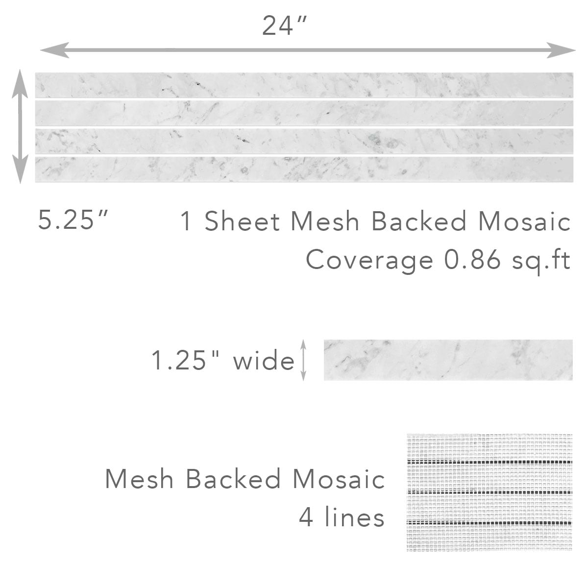 An exceptional backsplash tile measuring 24 inches long and 5.25 inches wide, featuring a contemporary four-line design. The gray color scheme of this tile gives it a modern look reminiscent of Carrara marble, making it a great choice for kitchen and bathroom projects. The elegant lines and modern design elements of this product will surely elevate your project.