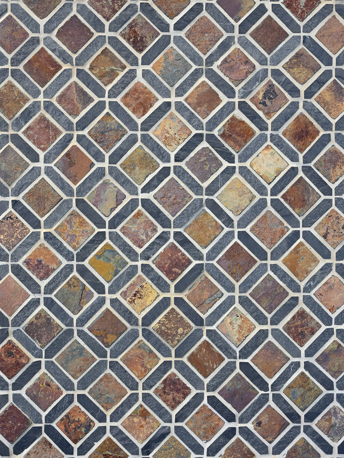 Upgrade your space with Rusty Brown Gray Mixed Diamond Slate Backsplash Tile! With its unexpectedly intricate shape, this slate mosaic tile is a perfect choice for a bold, natural, and stylish look! Crafted with precision, this tile showcases a rich palette of rusty brown and gray that brings the organic warmth of the slate stone. Its natural finish can enhance any space with a touch of rustic elegance.