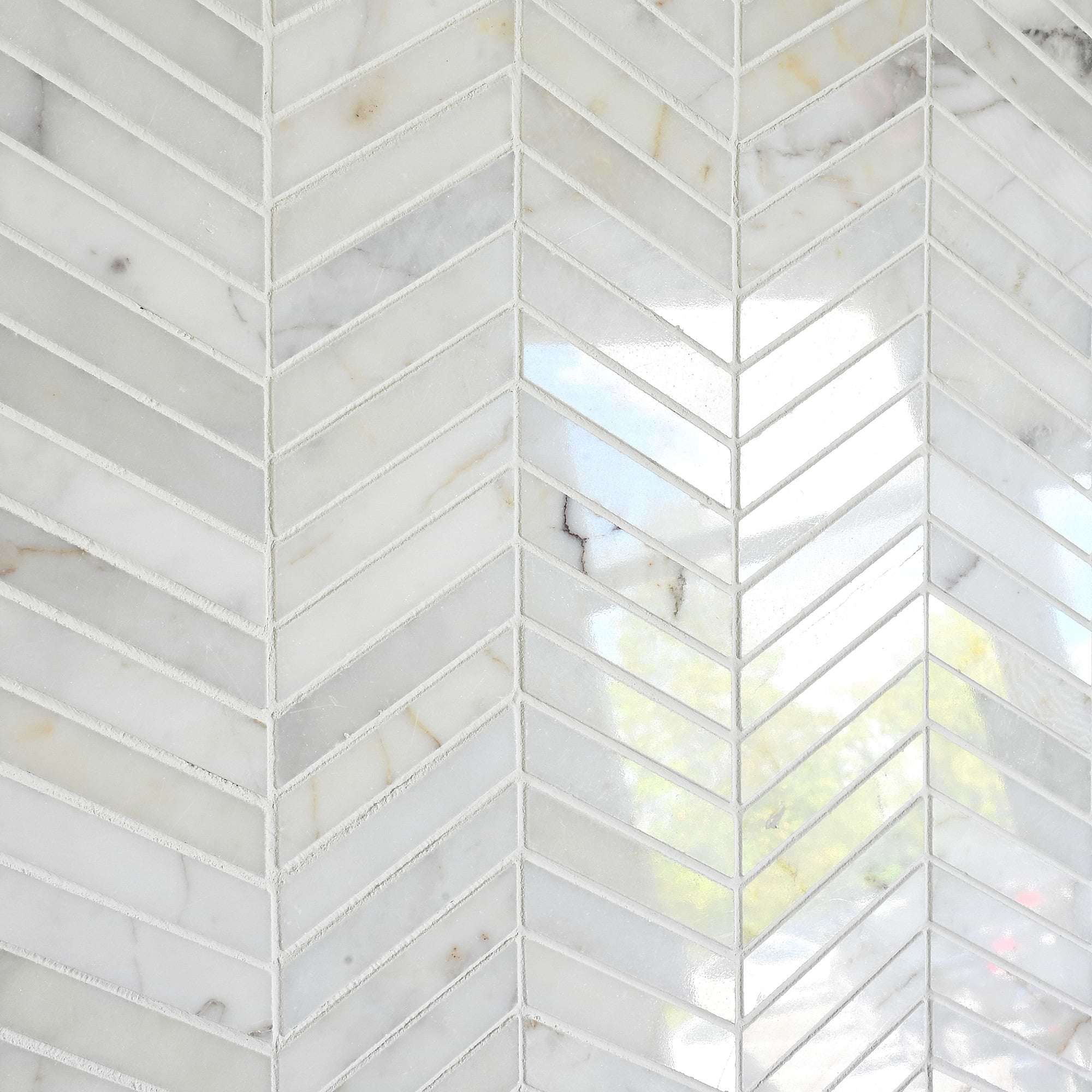 Are you looking for a sophisticated remodel design for your bathroom? These white chevron tiles will transform your dull bathroom into a luxurious spa retreat! Create a bright backdrop with its polished finish for your white bathroom vanity or cover your shower walls to create a dynamic look. This marble mosaic tile can also be used for light traffic floors or shower floors. This chevron mosaic sheet measures 12″ x 11″ and is mesh-mounted for easy installation.
