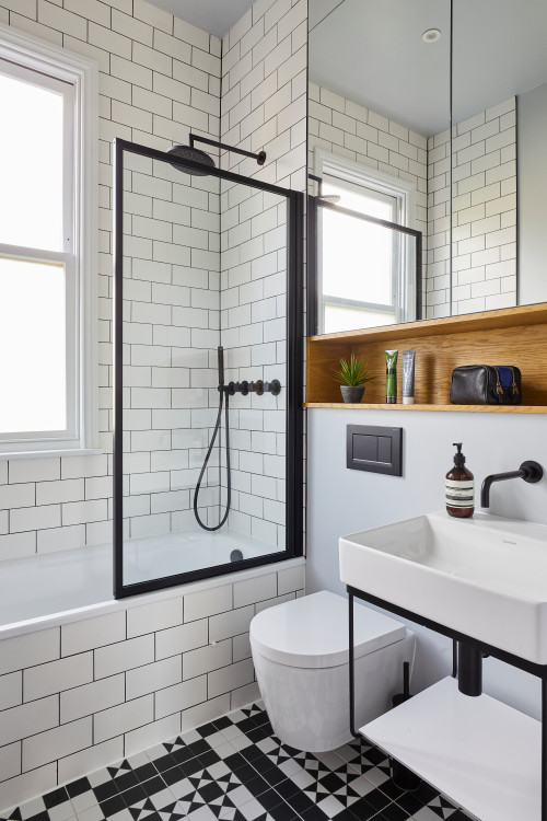This eclectic bathroom design offers an elegant appeal with its monochrome color scheme. The black and white patterned tiles bring a Mediterranean vibe while defining the shower area. With the transformation of storage products into decorative objects, the bathroom looks cluster-free and stylish. It creates a perfect combination of narrow space with the use of small-space bathroom storage alternatives together. The wooden towel rack and wicker basket each provide efficient and useful storage space while adding decorative vitality to the space.
