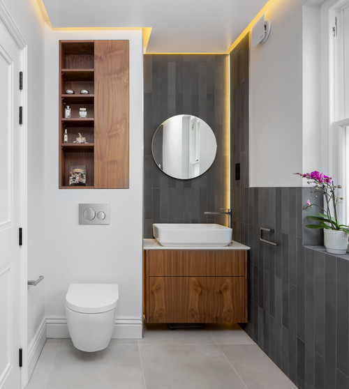 The gray wall and floor tiles, and white furniture create an elegant look in this contemporary bathroom. The cold appearance of the cabinets gains a natural warmth with the wooden surfaces. The mirrored upper cabinets provide storage space for personal items.