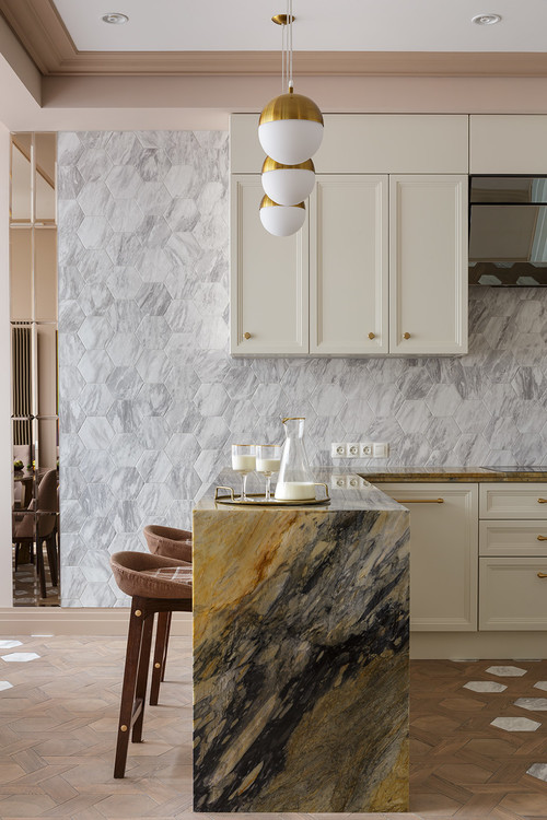 Calacatta Gold Marble Backsplash and Countertops with Two-tone Cabinetry