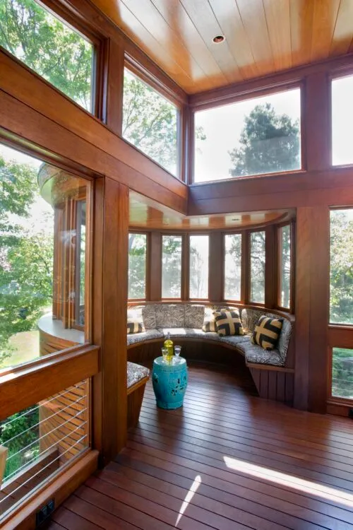 In the sunroom, where wood plays a major role in the space design, wood tones used in the space were preferred for the joinery of the windows on the roof and walls.
