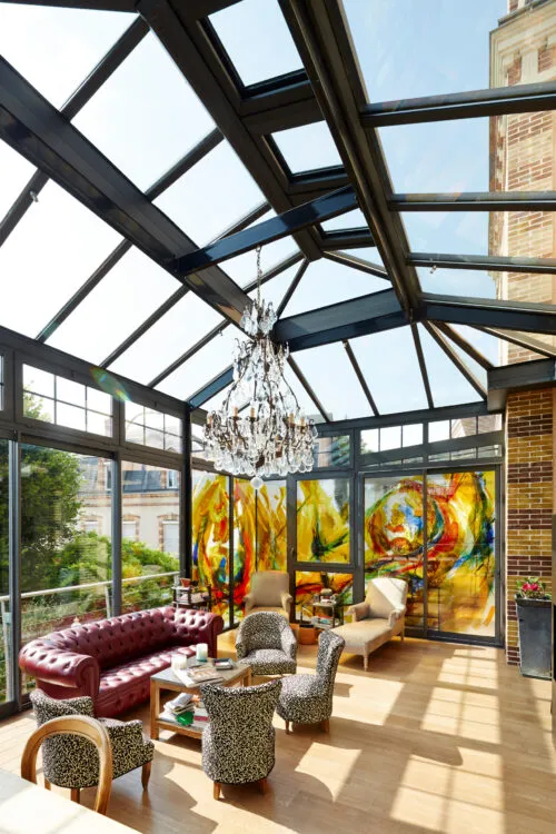 A red leather sofa is used in the sunroom designed in a contemporary style. Wooden legs and patterned fabric were preferred for the other single seats. In the place where a part of the glass surface is covered with a colored painting, window frames were preferred in black. The window paintings act as window treatments that provide privacy and light control.