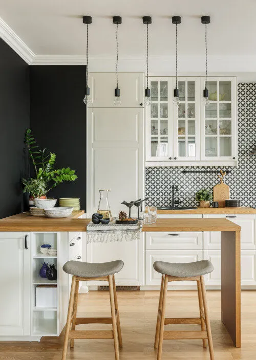 The patterned backsplash application, which is in the trends of 2024 in Scandinavian kitchen design, combines white cabinets and wooden countertops. Together with the wooden texture on the floor, the wood in the kitchen texture brings the space to a warm atmosphere in harmony. The kitchen surrounded by white cabinets creates a more profound image with the touch of black walls. The simple and elegant lighting solution with the pendant lighting on the ceiling turns simplicity into a work of art with the use of simple products.