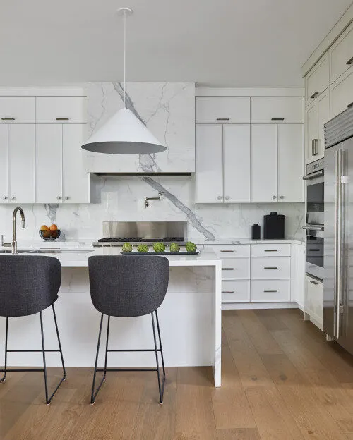 Scandinavian Kitchen Design with White Cabinets and Marble Textured Slab Backsplash
