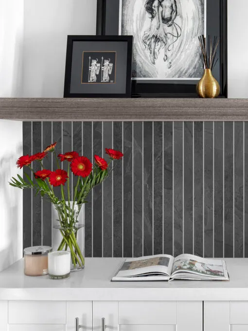 Black Vertical Tile Backsplash with Wood Floating Shelf