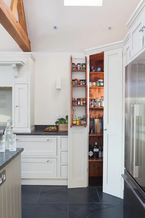 The elegant and stylish white kitchen has useful pantry cabinets. Nice walnut colour in it creates such a beautiful harmony with together white cabinets. The tiny little spice rack is well thought.